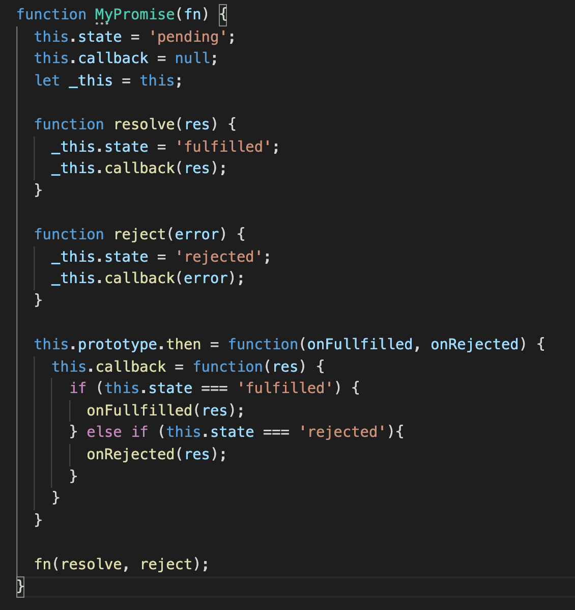根据Promises/A+的描述,我们不难知道Promise本身有三种状态:pending、fulfilled和rejected,Promise正是根据这三种状态控制自身的执行过程。Promise的初始状态是pending, 而resolve和reject这两个函数是用来修改Promise的状态的,其中resolve会将Promise的状态修改为fulfilled, reject会将Promise的状态修改为rejected。那么我们可以首先简单实现Promise的这些设计。