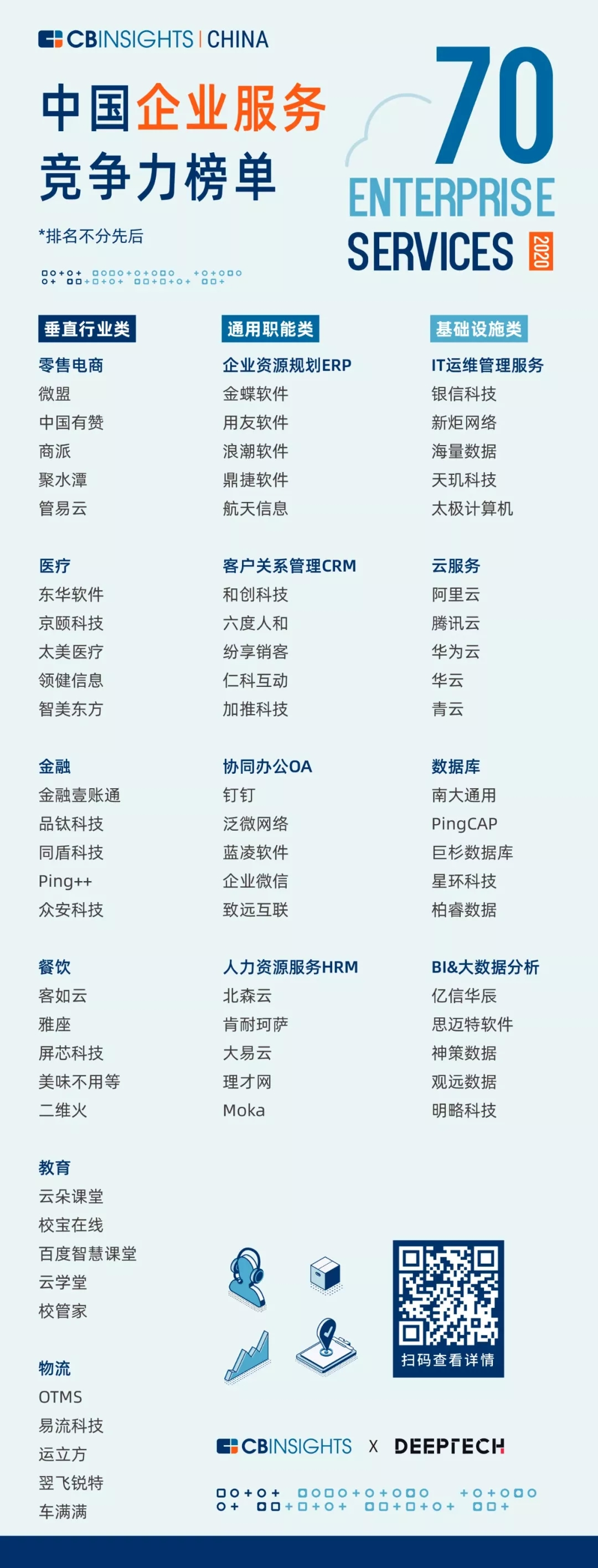 CB Insights 中国团队依据 DPTC 体系(Depth、Popularity、Tendency、Collaboration),从四个维度全方位评估企业的自身实力、外界态度、发展趋势和合作表现,遴选出70家企业服务企业,尝试描摹一幅中国企业服务可及的未来图景,与君同馔。