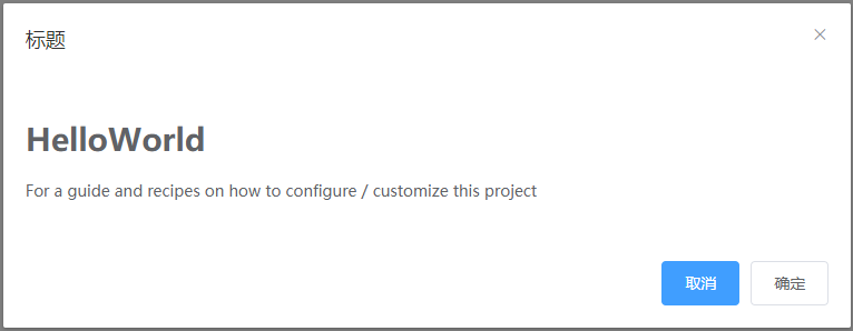 // App.vue <template> <div id="app"> <div id="nav"> <router-link to="/">Home</router-link> | <router-link to="/about">About</router-link> </div> </div> </template> <script> import HelloWorld from './components/HelloWorld' export default { mounted() { const vm = this.$alert(HelloWorld, { msg: 'HelloWorld', // 内容区组件属性传递 ref: 'hello' // 要获取内容区组件内容该字段必传 }, { title: '标题', // 弹框标题 showButtons: true, // 是否显示操作按钮 buttons: [ // 按钮配置:[标题,点击后是否关闭弹框, 点击后执行的事件] { title: '取消', close: true, callback: () => { alert('取消') } }, { title: '确定', close: false, callback: (data) => { // data 是内容区组件实例 console.log(data.msg) vm.hide() // destroyInstance=false 时设置 display=none alert('确定') setTimeout(() => { vm.show() // destroyInstance=false 时设置 display=block setTimeout(() => { vm.remove() // 移除销毁 dom }, 1000) }, 1000) } } ], destroyInstance: false // 关闭时弹框是否移除销毁 dom }) } } </script>