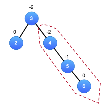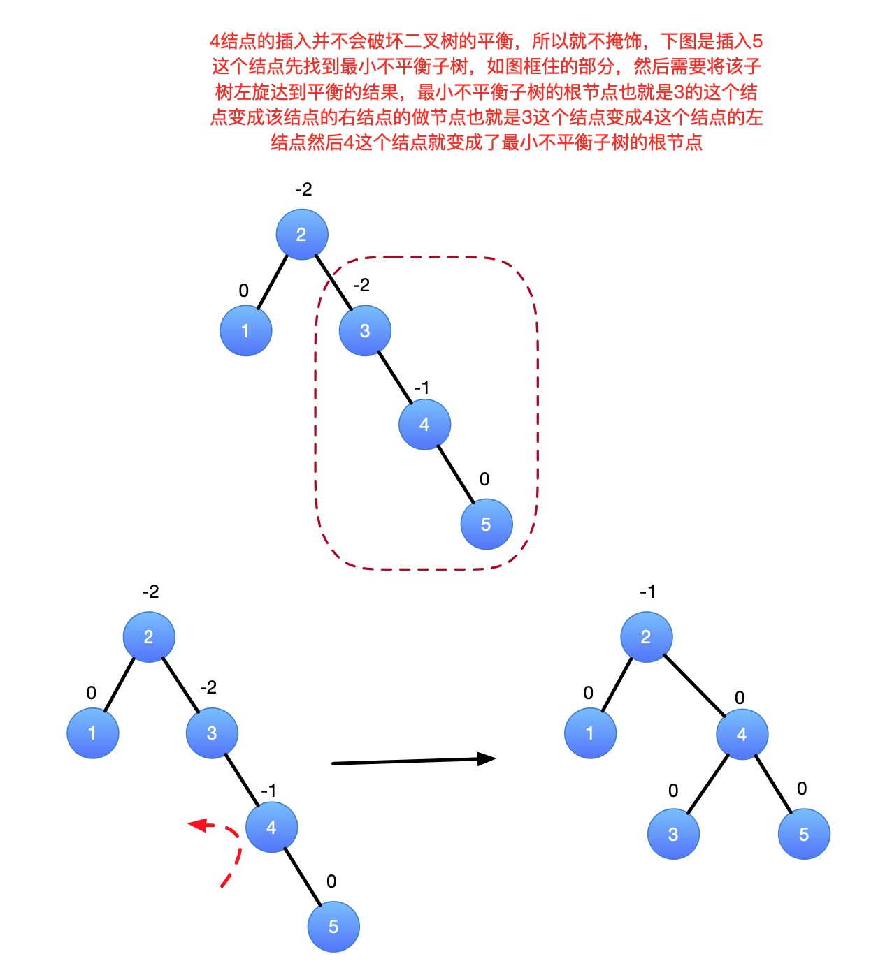 - 最小不平衡子树:距离插⼊点最近的,且平衡因⼦的绝对值⼤于1的结点为根的⼦树如图圈住的就是该树的最小不平衡子树