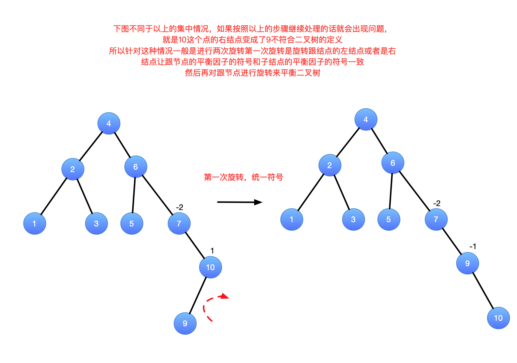 注:当跟结点的符号和子结点的符号一致只需要左旋或者右旋,不一致的时候需要双旋先旋转一次让符号一致,然后在旋转调整二叉树的平衡,如果符号一致符号为负则右高需要左旋,如果符号为正则左高需要右旋
