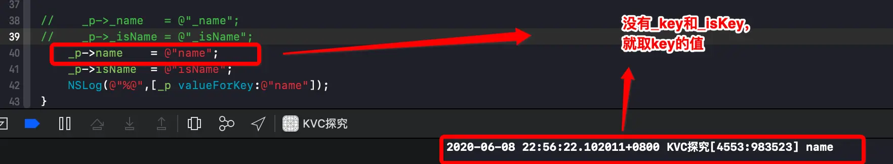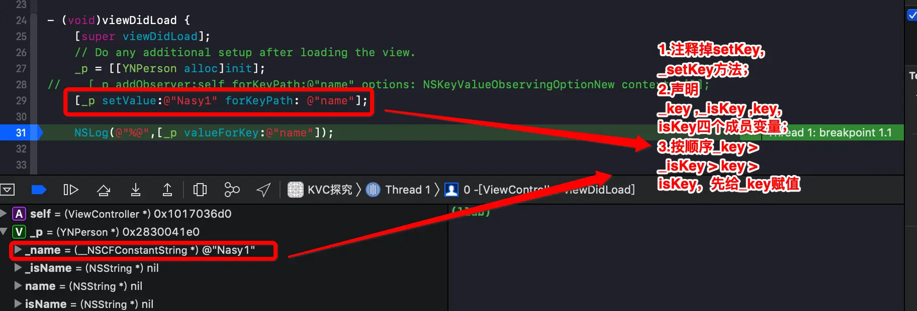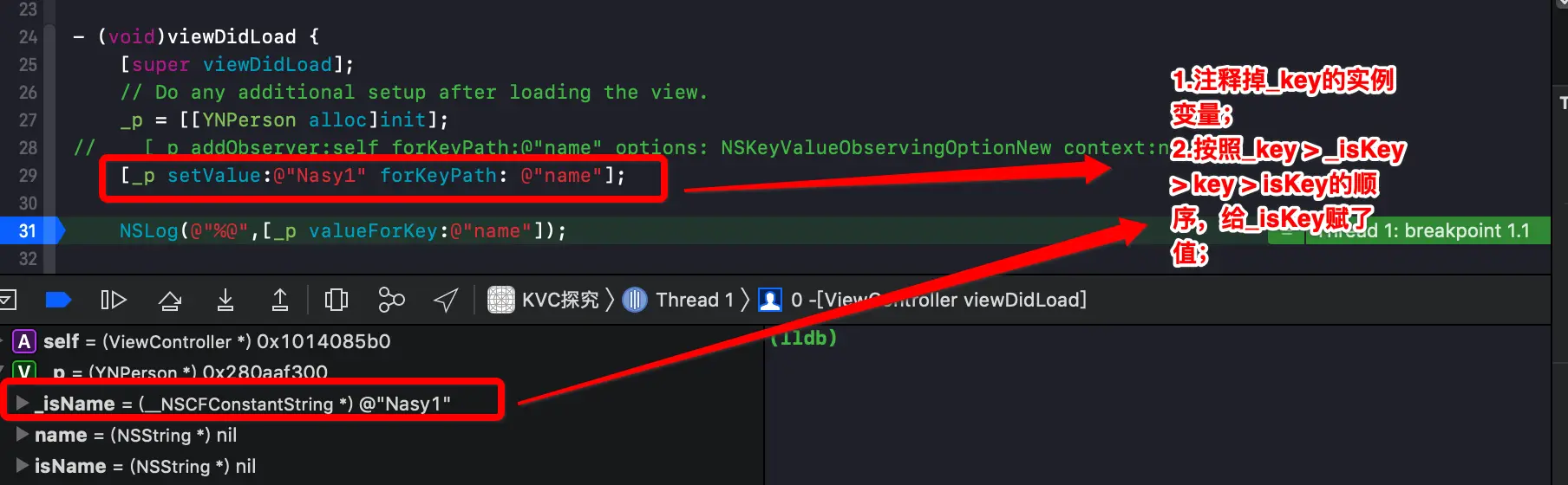 @implementation ViewController - (void)viewDidLoad { [super viewDidLoad]; _p = [[YNPerson alloc]init]; _p->_name = @"_name"; _p->_isName = @"_isName"; _p->name = @"name"; _p->isName = @"isName"; NSLog(@"%@",[_p valueForKey:@"name"]); } @end- 2.1 四个成员变量都存在,优先取