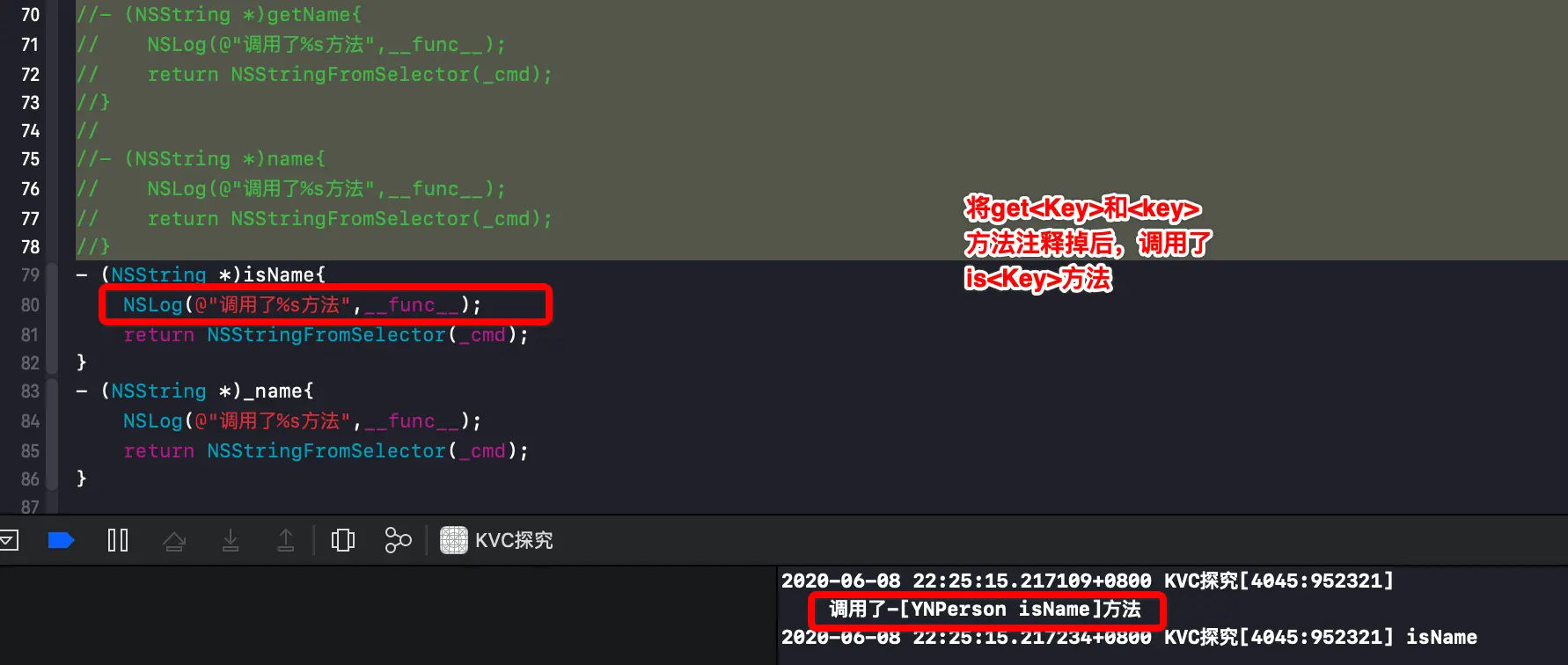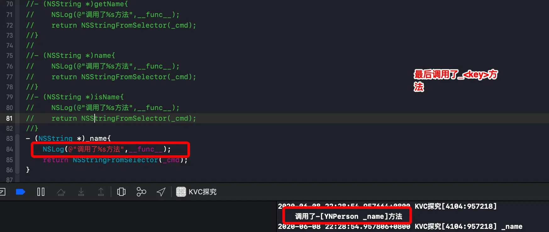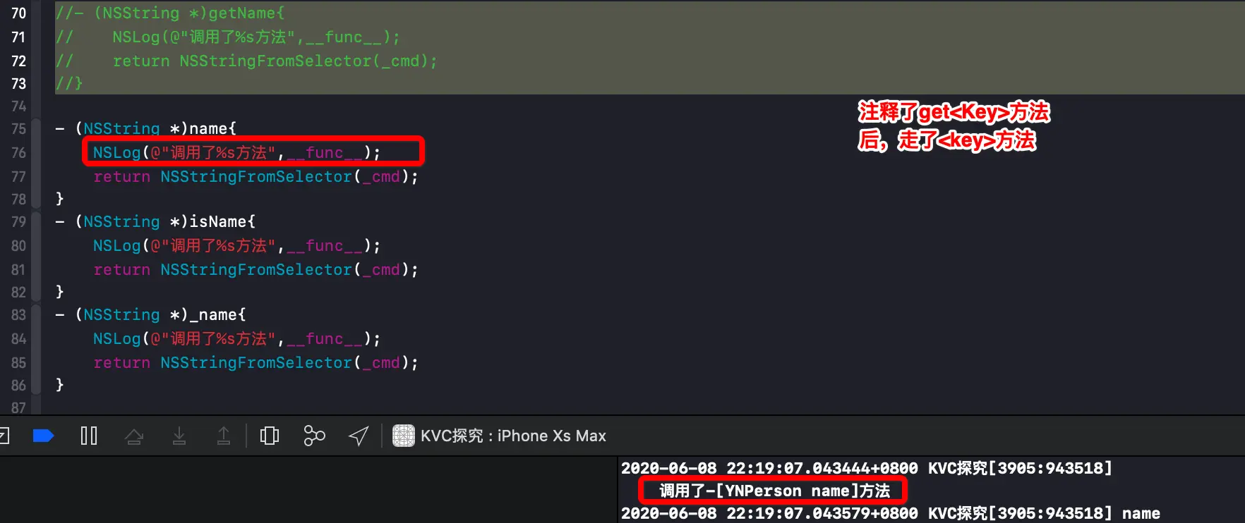 @implementation ViewController - (void)viewDidLoad { [super viewDidLoad]; _p = [[YNPerson alloc]init]; NSLog(@"%@",[_p valueForKey:@"name"]); } @end- 1.1 当有四个方法时,会优先调用