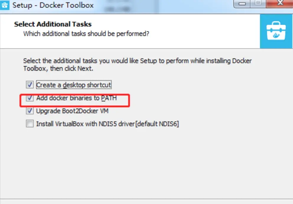 Win7/Win8系统双击下载的DockerToolbox-19.03.1.exe,根据指引安装,如果VirualBox或Git已经安装,可以不勾选安装,下图中这个选项建议勾选。