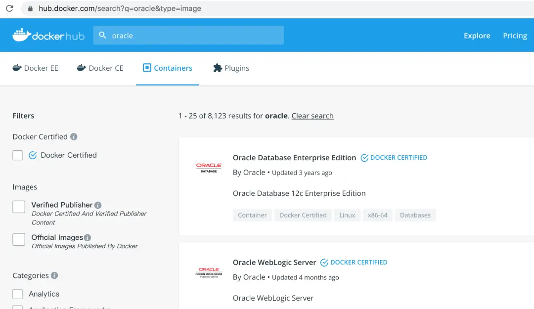 注册完成后,在https://hub.docker.com/search页面搜索Oracle镜像。