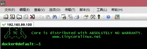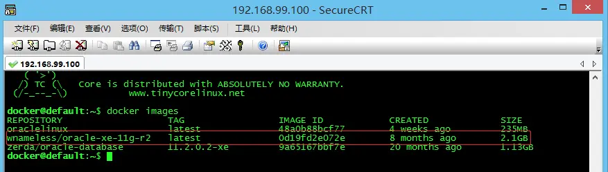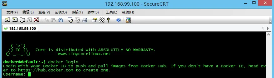 因为Docker Quickstart Terminal和命令行窗口都不是很好用,所以,我们可以使用常用的ssh软件登录到创建的default虚拟机,我这里使用SecureCRT,其它软件如XShell也可以。登录主机名:192.168.99.100,端口:22,用户名:docker,密码:tcuser,登录成功后如下图。