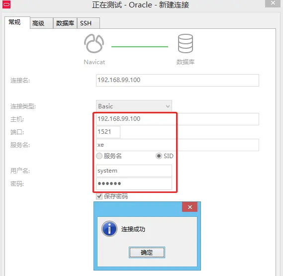 到这里,我们就可以使用数据库操作客户端连接Oracle数据库并使用了。我这里使用Navicat,连接信息如下:hostname:192.168.99.10,port:1521,sid:xe,username:system,password:oracle。