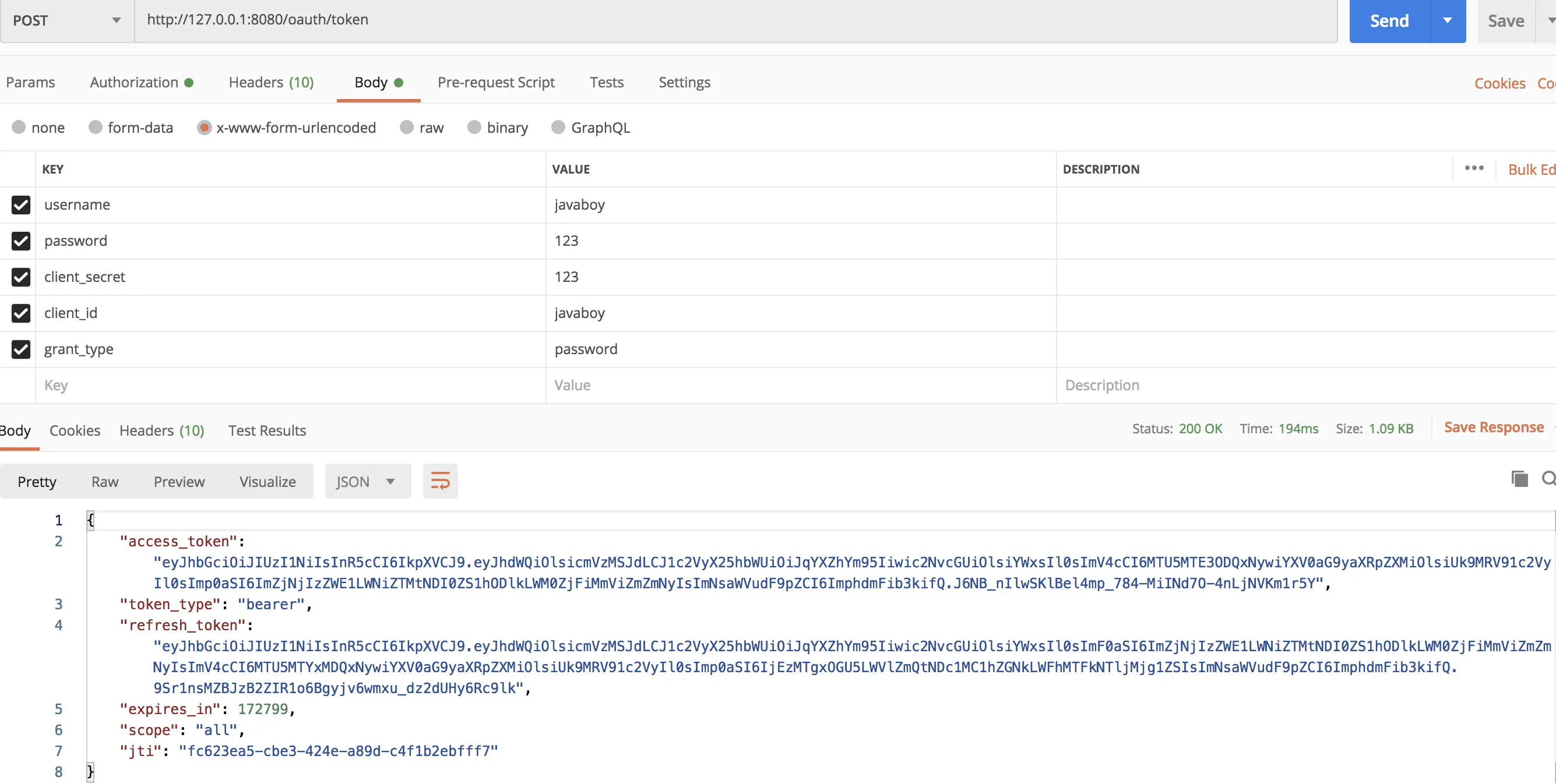 这段配置跟前面的类似,主要是 SecurityScheme 不同。这里采用了 OAuthBuilder 来构建,构建时即得配置 token 的获取地址。