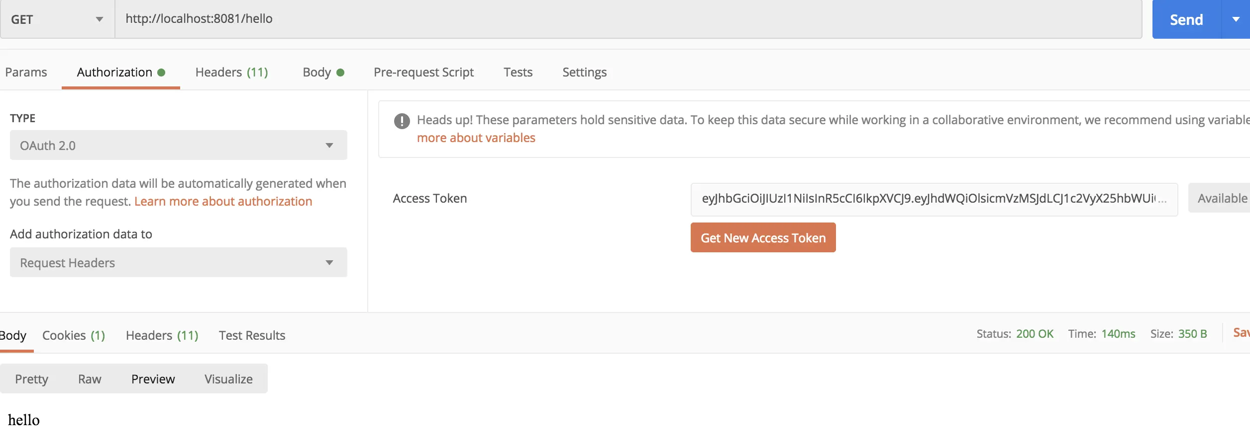 - 通过 securitySchemes 来配置全局参数,这里的配置是一个名为 Authorization 的请求头(OAuth2 中需要携带的请求头)。