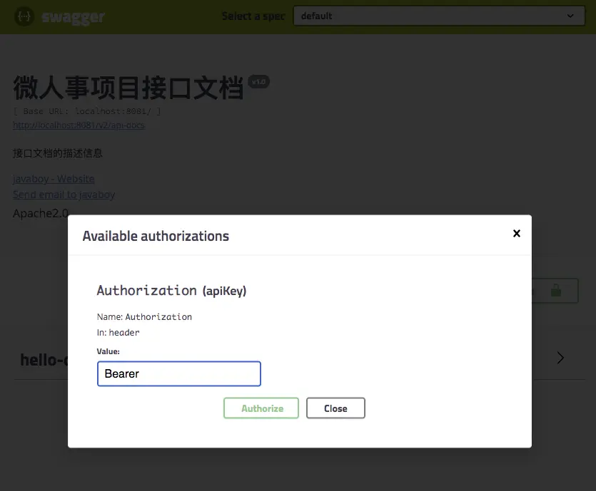 大家可以看到,页面中多了一个 Authorize 按钮,点击该按钮,输入 Bearer ${token},如下: