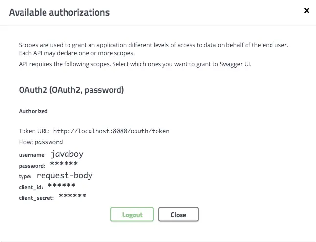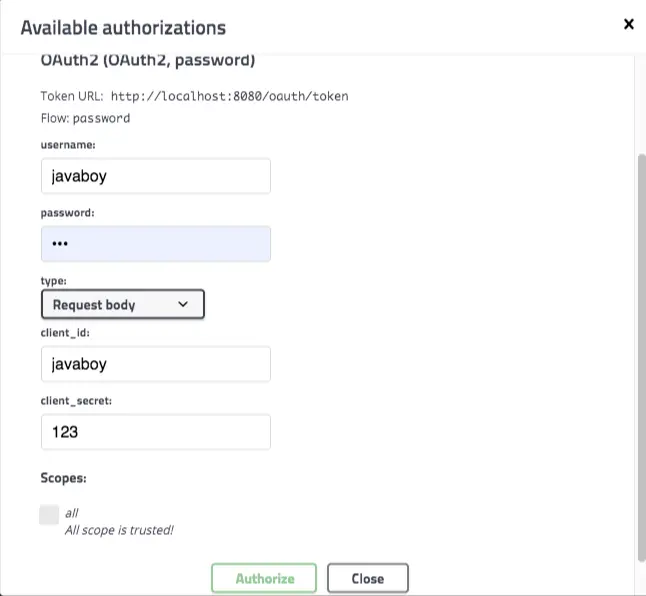 这种方式最大的好处就是不用通过其他途径获取 access_token,直接在 swagger-ui 页面输入 password 模式的认证参数即可。非常方便,仅限于 OAuth2 模式。