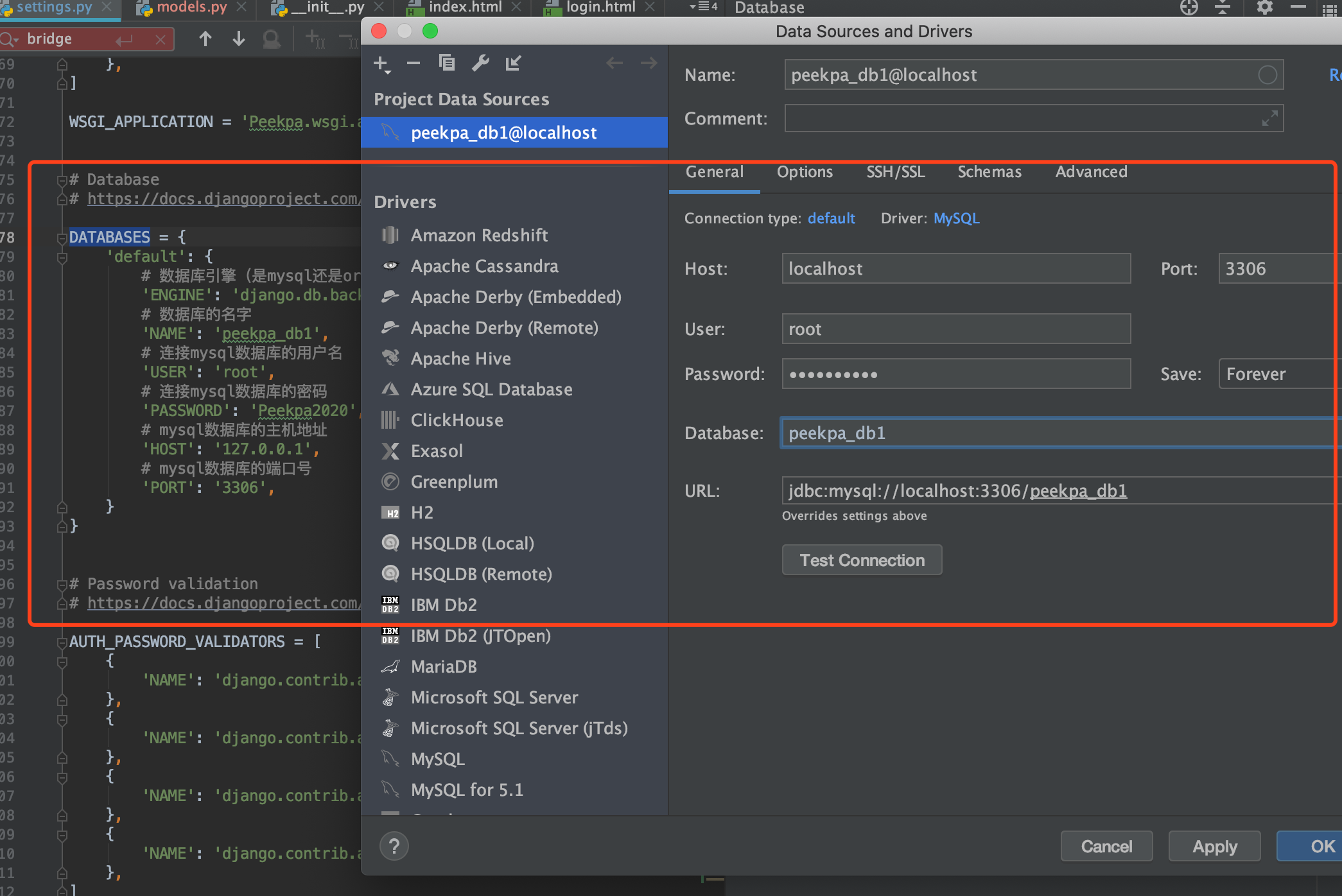 接着配置我们的本地数据库的基本信息,user,password还有database,这三个信息在我们的settings.py文件中的DATABASES里就有,填写好之后,点击OK。