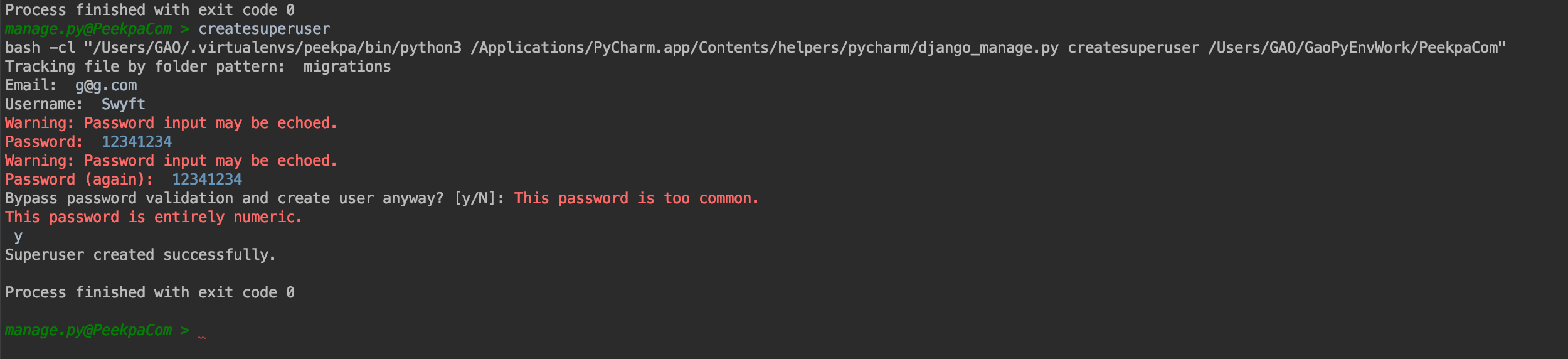 这样子就说明成功了,接下来,我们需要在manage.py命令中,通过createsuperuser来创建我们的超级管理员:
