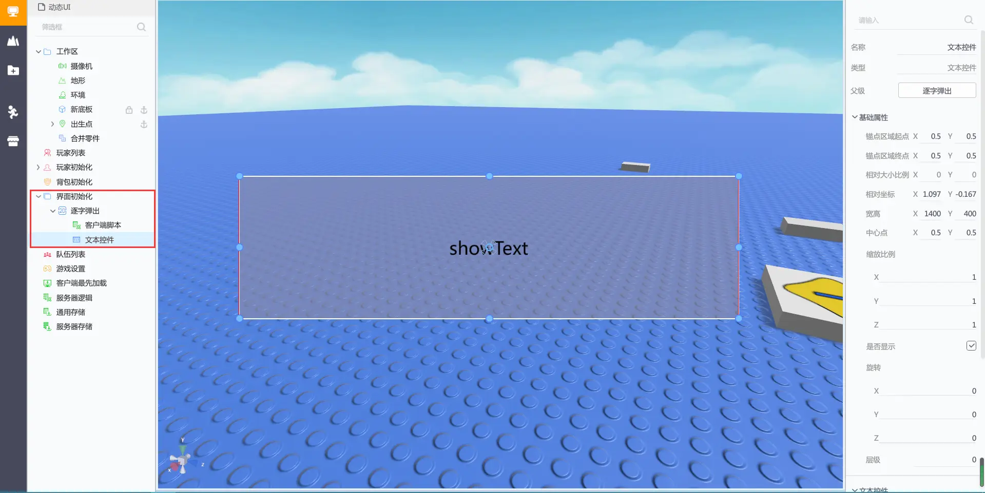 在界面初始化下创建一个2D容器界面,重命名为逐字弹出,在2D容器界面下创建一个文本控件,调整宽高均为1400,400。在2D容器界面下创建一个客户端脚本,如下图所示: