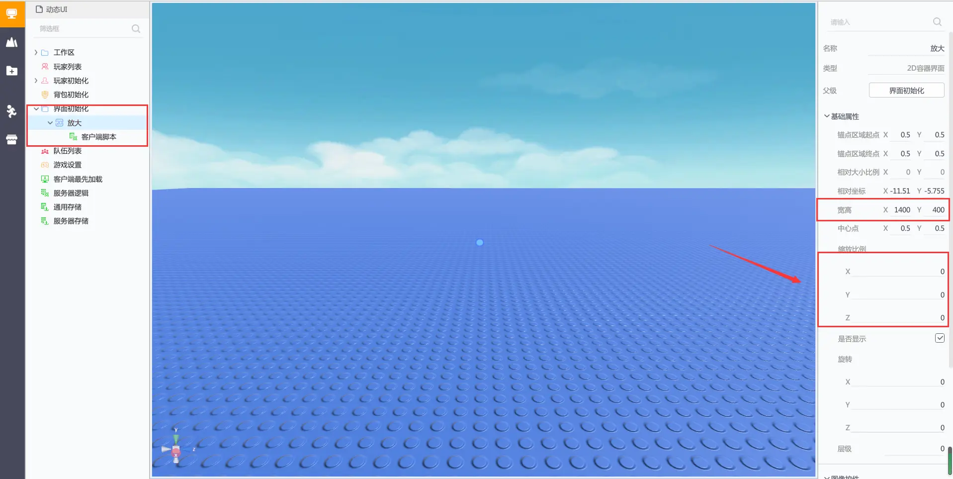 在界面初始化下创建一个2D容器界面,重命名为放大,调整宽高均为1400,400,调整缩放比例为(0,0,0)在2D容器界面下创建一个客户端脚本,如下图所示: