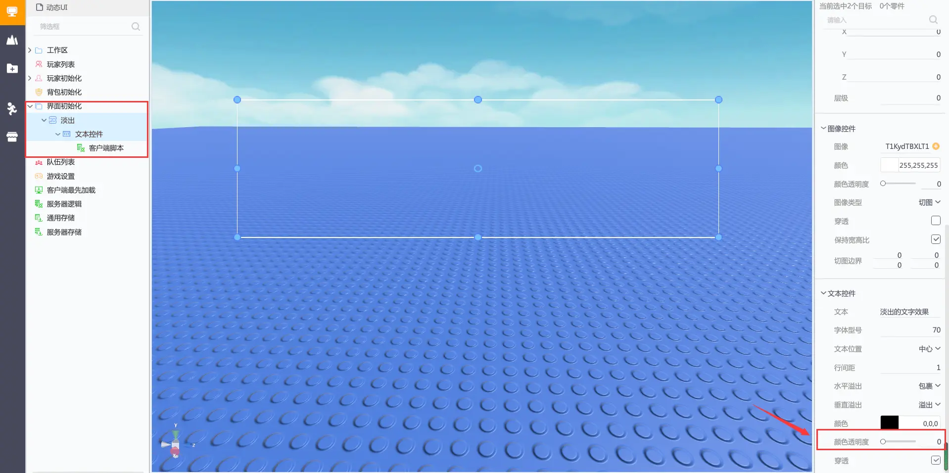 在界面初始化下创建一个2D容器界面,重命名为淡出,在2D容器界面下创建一个文本控件,调整宽高均为1400,400,颜色透明度均调整为0。在文本控件下创建一个客户端脚本,如下图所示: