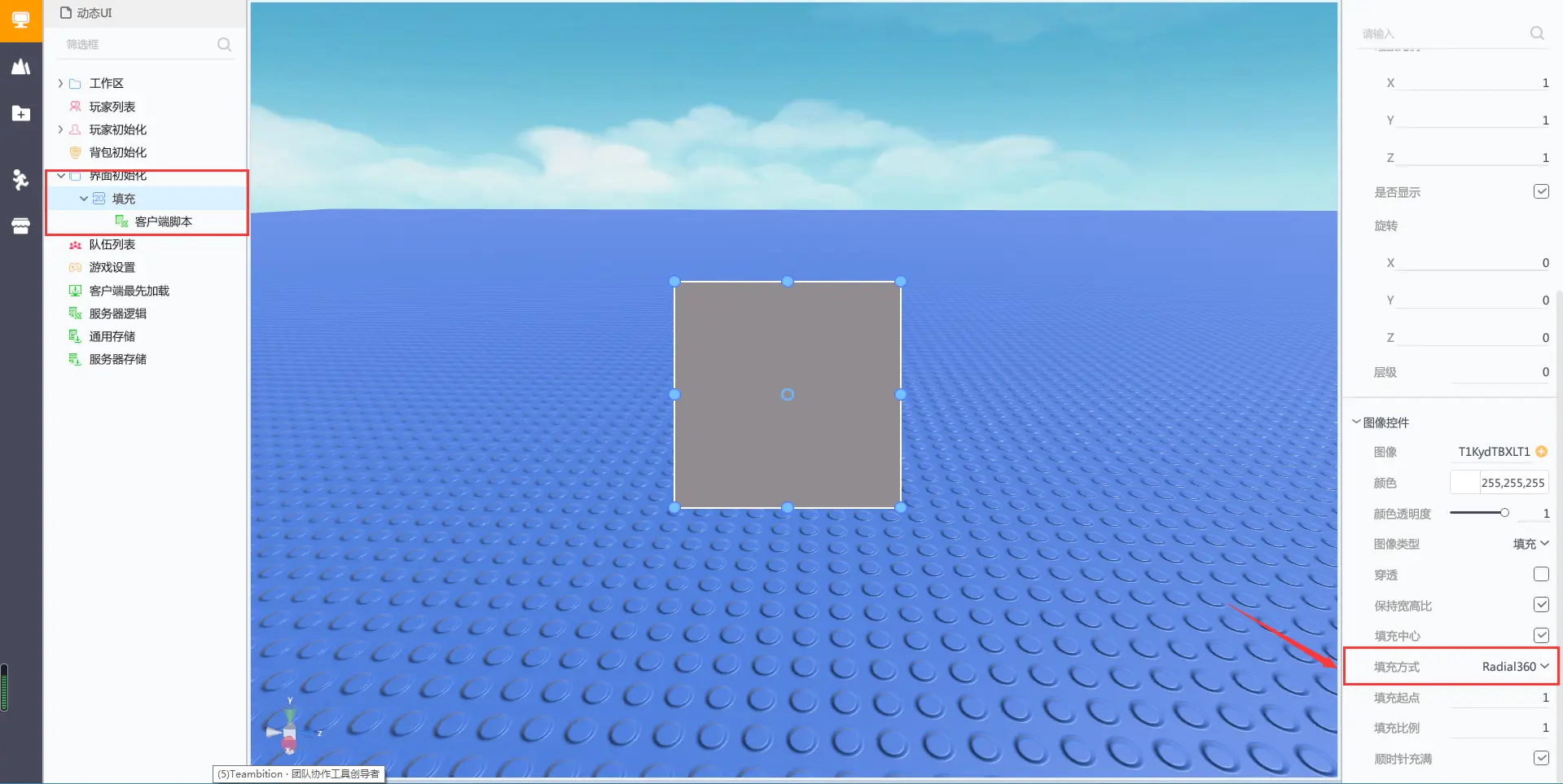 在界面初始化下创建一个2D容器界面,重命名为填充,把图像控件的填充方式修改为Radial360,在2D容器界面下创建一个客户端脚本,如下图所示: