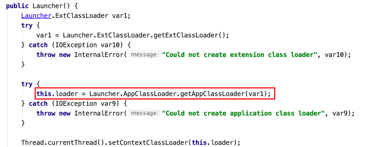 而Launcher整个类的创建,想来读者也已经看到loader这个变量了,通过getAppClassLoader()这个函数所创建的loader也就是我们口中所说的应用程序类加载器了,这也从源码上讲述了双亲委派机制的存在。