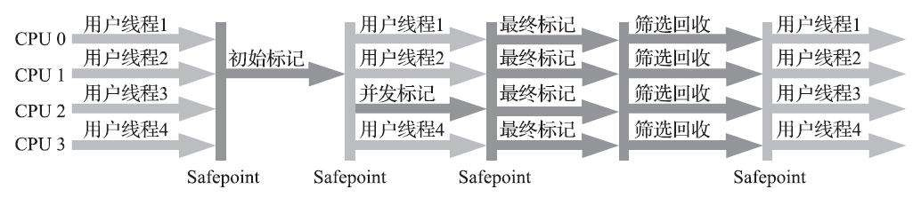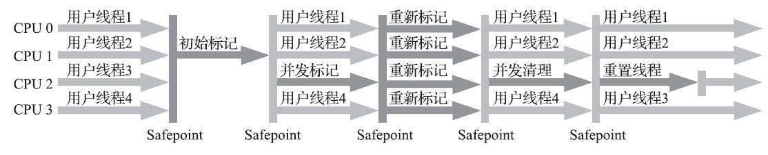 (1)初始标记。(2)并发标记。(3)重新标记。(4)并发清理。其中,初始标记和重新标记是会发生Stop The World的,不过时间比较短。- 三大缺憾: (1)对处理器资源的敏感,并且自己会占用去一部分线程,导致吞吐率下降。(2)无法处理标记完成以后出现的垃圾。(3)标记-清理算法的空间碎片问题