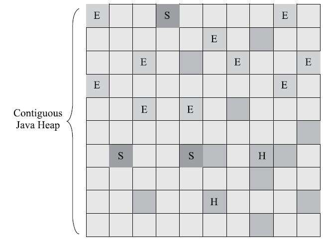 - G1回收器: 同样的遵循年代划分的设计,但是面向的对象的回收策略以性价比作为了基准。图中的每一个空格也就是