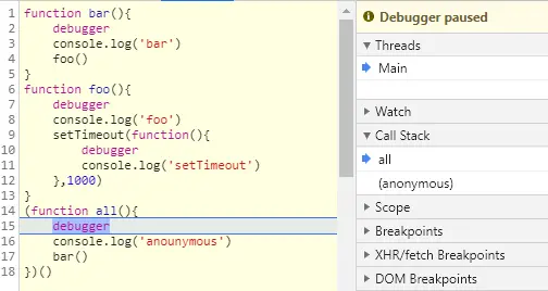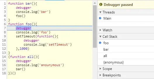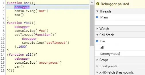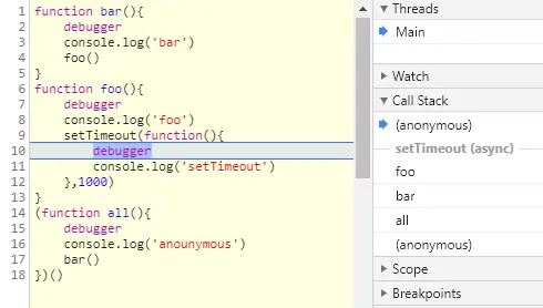 - 作用:通过调用栈,我们能够追踪:哪个函数正执行;执行的函数体中又调用了哪个函数;以及每一帧的上下文+作用域