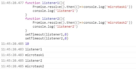 同步执行两个setTimeout,会将 listener1和listener2加入到task queue,同步代码执行就结束。先执行listener1,将microtask1加入微任务队列,listener1执行完后,调用栈清空,即使这时候task queue还有listener2,也会先执行所有微任务,将所有微任务清空后,再执行listener2,因此输出顺序是 listener1,microtask1,listener2,microtask2
