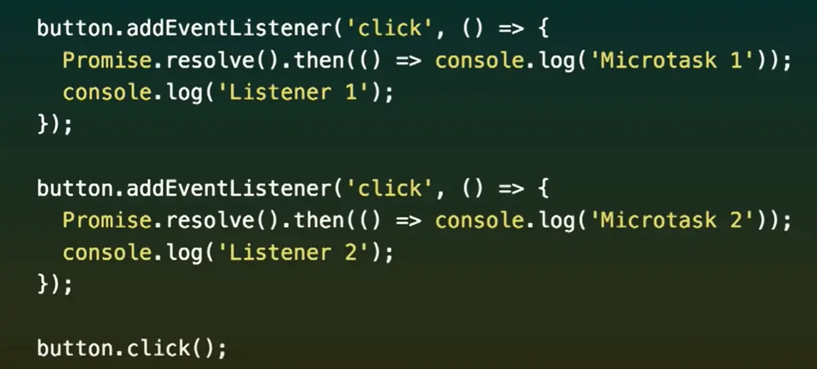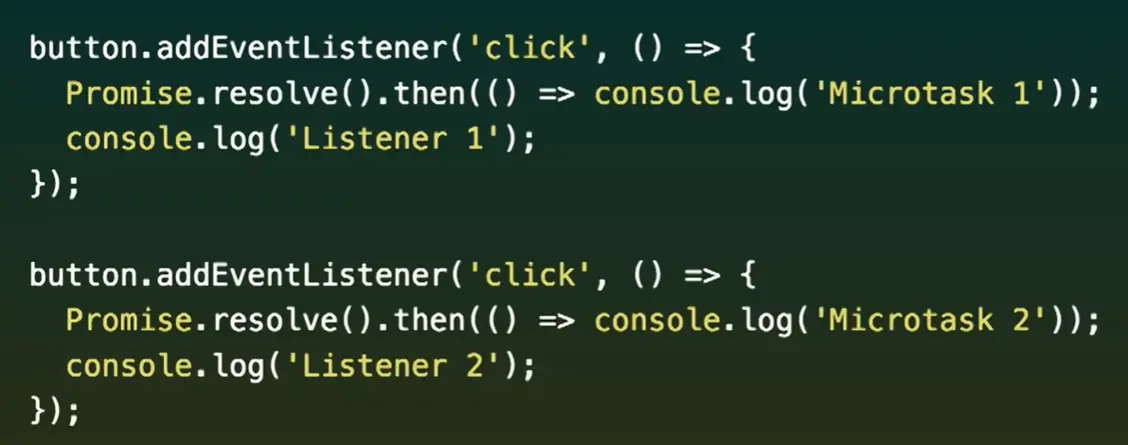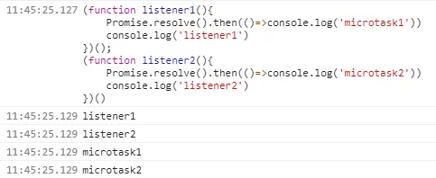 在控制台中执行一段代码,会当做同步代码来处理。listener1执行后,微任务队列+1,但是因为是同步执行的代码,所以会立即执行listener2,微任务队列+1,所以顺序是listener1,listener2,microtask1,microtask2