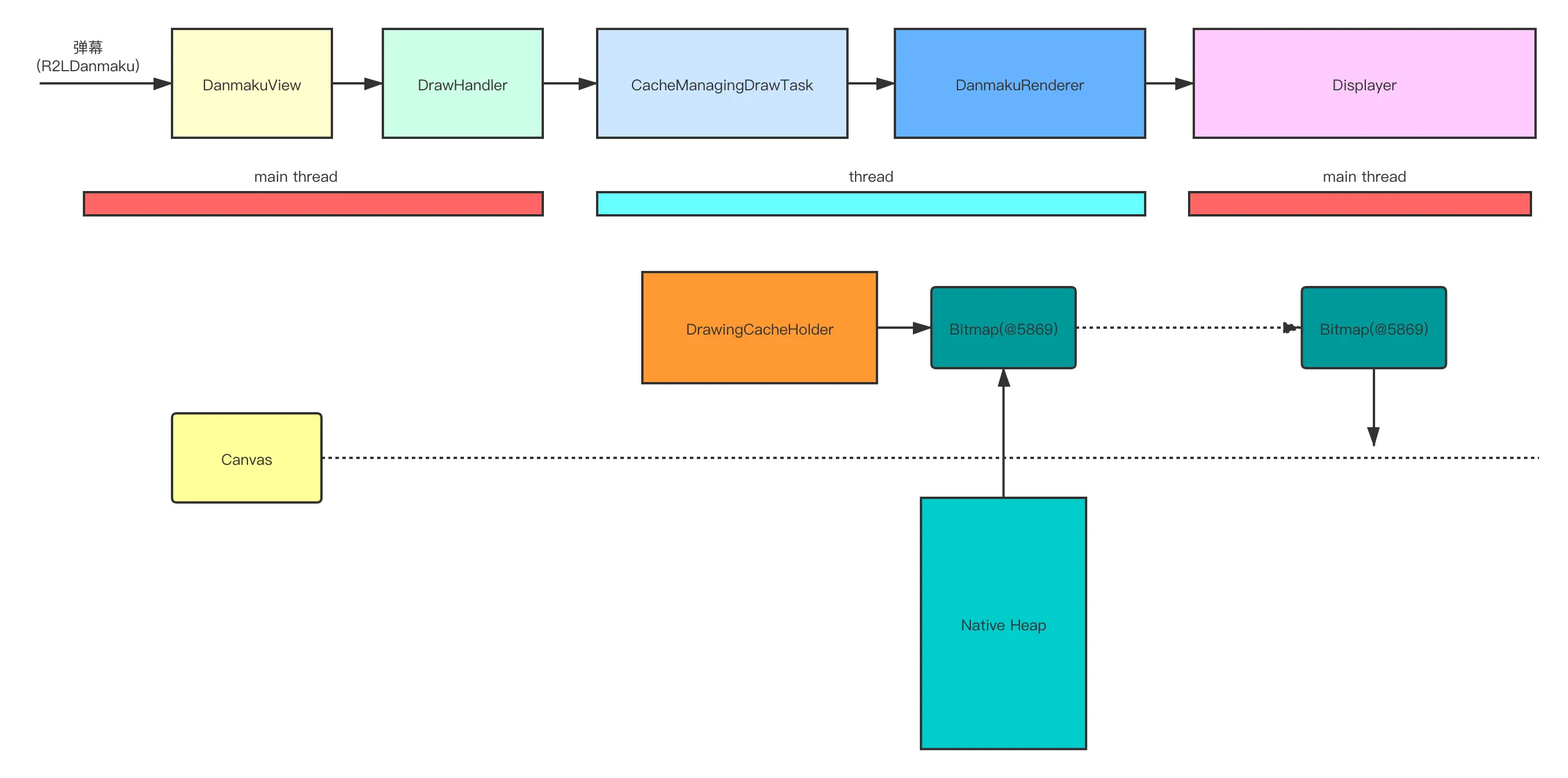 R2LDanmaku: 一个弹幕对象, 里面包含x、y坐标, 缓存的Bitmap等属性DanmakuView: 用来承载弹幕显示的ViewGroup, 除了它之外还有DanmakuSurfaceView、DanmakuTextureViewDrawHandler: 一个绑定了异步HandlerThread的Handler, 控制整个弹幕的显示逻辑CacheManagingDrawTask: 维护需要绘制的弹幕列表, 控制弹幕缓存逻辑DrawingCacheHolder: 弹幕缓存的实现,缓存的是Bitmap, 与BaseDanmaku绑定DanmakuRenderer: 对弹幕做一些过滤、碰撞检测、测量、布局、缓存等工作Displayer: 持有Canvas画布, 绘制弹幕