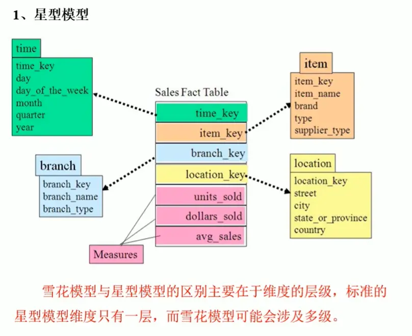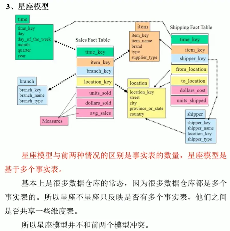 不满足三范式,大量冗余,将表分为事实表和维度表两类。可以分为三类:星型模型、星座模型、雪花模型。