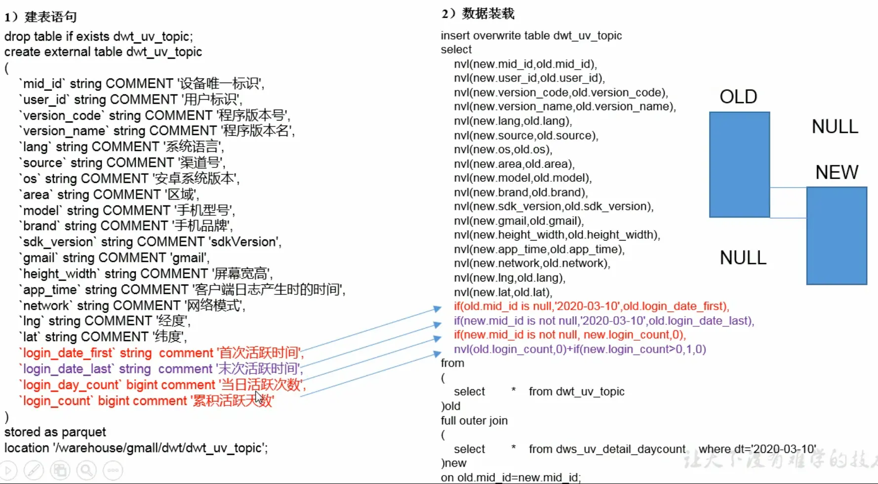 - DWD 明细数据层:对ODS进行清洗,去除空值、脏数据、超过极限范围的数据等,且结构与粒度与ODS保持一致。ETL工具:HQL\MR\SparkSQL\Python\kettle