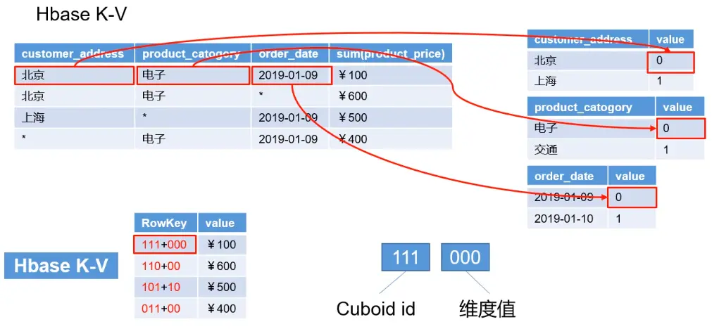 cuboid ID表示字段是否聚合,维度值则是字段对应的值。