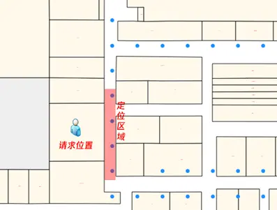 然后,基于不同排序结果,我们采用了不同的定位策略。如果我们判断出目前发出请求的位置更可能是在人工采集过指纹的网格中,那么我们采用已有的定位流程,根据网格内的指纹特征,选择最相似的1个或几个网格来计算目标的位置。如果我们判断出目标发出定位请求的位置更可能是在某个店铺中,那么我们会找到店铺周围的那些网格,如图5所示,用这些网格来最终确定目标的位置,从而将定位结果约束在目标最可能存在店铺门口,以免产生过大的定位偏移。