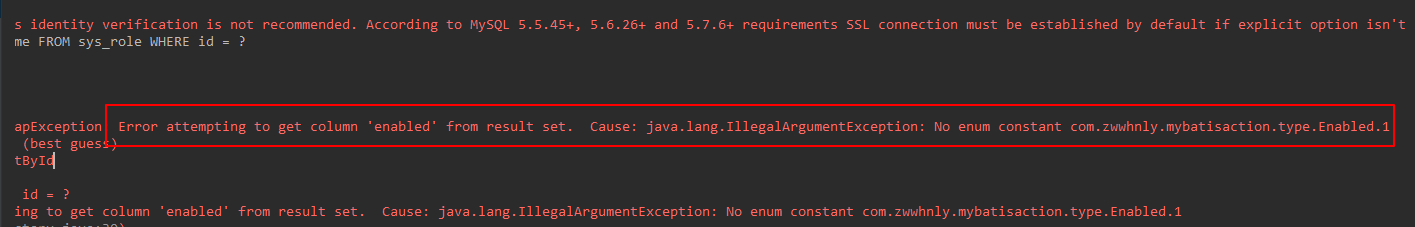Error querying database. Cause: org.apache.ibatis.executor.result.ResultMapException: Error attempting to get column 'enabled' from result set. Cause: java.lang.IllegalArgumentException: No enum constant com.zwwhnly.mybatisaction.type.Enabled.1