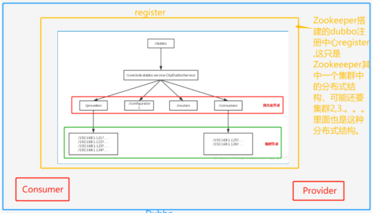 比如Provider注册的是 192.168.1.(描述121是吃饭,122睡觉,123打游戏,124健身四种不同的服务) 2-0、 、dubbo--这是dubbo在ZooKeeper上创建的根节点 /dubbo 2-1 、 Dubbo在Zookeeper上注册的节点目录:假设接口名称是:com.bob.dubbo.service.CityDubboService。 这是服务节点,代表了Dubbo的一个服务 /dubbo/com.bob.dubbo.service.CityDubboService 2-2 、 Dubbo启动时,Consumer和Provider都会把自身的URL格式化为字符串,然后注册到zookeeper相应节点下,作为一个临时节点,当连断开时,节点被删除。 这是服务提供者的根节点,其子节点代表了每一个服务真正的提供者/dubbo/com.bob.dubbo.service.CityDubboService/providers 这是服务消费者的根节点,其子节点代表每一个服务真正的消费者;/dubbo/com.bob.dubbo.service.CityDubboService/consumers 2-3、 Consumer在启动时,不仅仅会注册自身到 …/consumers/目录下,同时还会订阅…/providers目录下所有子节点,具体的看你订阅具体是哪一个节点(比如订阅健身这些服务),实时获取其上Provider的URL字符串信息。register返回给Consumer这个ip--192.168.1.124,Consumer拿着这个iP直接去找Provider调用这项服务--健身。 2-4 、监控中心启动时订阅com.bob.dubbo.service.CityDubboService目录下的所有提供者和消费者URL。