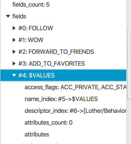 我们从 javap 中分析知道在 BehaviorEnum 中定义了四个类型为 BehaviorEnum 的静态常量。而这四个静态常量的初始化是在 static 代码块里面初始化的 , 分别使用 BehaviorEnum 的子类 BehaviorEnum$1 BehaviorEnum$2 BehaviorEnum$3 BehaviorEnum$4 进行实例化。那初始化完成之后这段代码还没结束啊,还有那么长、它还干了什么 ? 没错,它就是将上面的四个静态常量放在一个静态数组 VALUES 里面。不对,上面的反编译代码里根本就没有这个静态变量的声明啊 , 确实如此,因为这个 VALUES 这个变量是编译器自己合成的,我们用一个工具来看看 BehaviorEnum.class 的文件内容 (感兴趣而又不知道是啥的公众号内回复关键字:反编译,获取下载链接)