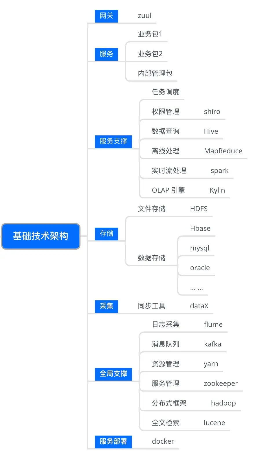 其实对于数据中台落地场景的技术体系我觉得有两种,一种是海量数据,数据中台在其中提供了存储能力,管理能力,计算能力,分析能力以及数据开放能力。另一种是数据量不是特别大的情况,那么中台的计算能力就没有那么突出,更多的是管理、分析、开放等能力。这里我自己总结了一套大数据架构,并不仅仅是针对中台的技术,而是一套通用架构如下: