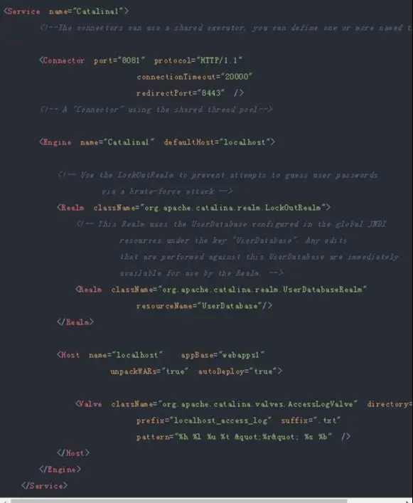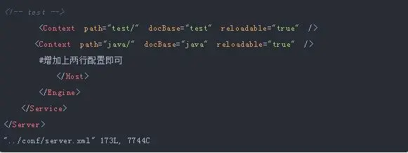 server.xml已有第一个项目的配置信息,现在需要新增第二个项目的配置,在Server节点下,新增一个Service节点,第2个Service节点直接复制第1个Service内容修改即可。
