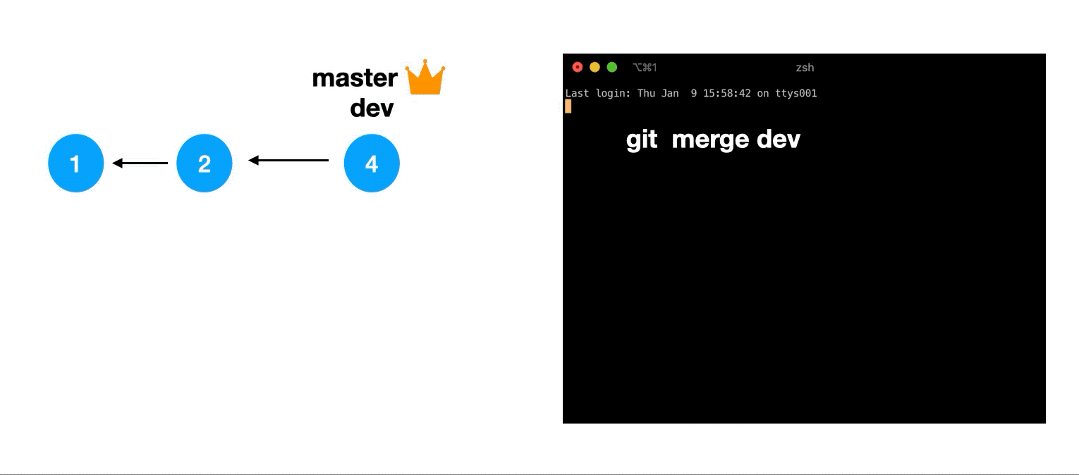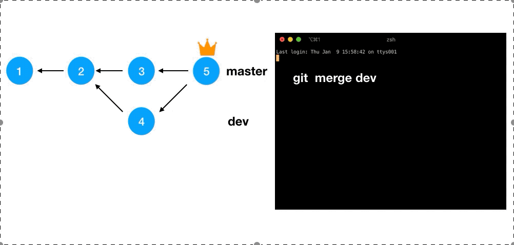 git merge dev命令,需要注意的是,git merge根据不同情况,有两种不同的合并模式,一种称作fast-forward,另一种我们暂且称之为no-fast-forward