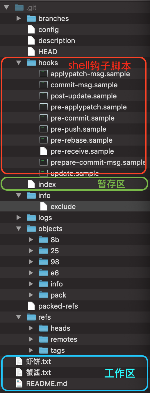| hooks | shell编写的钩子脚本目录,里面包含许多后缀名为.sample文件,可通过删除.sample后缀来启用钩子 | 方便在git的各个阶段自动运行一些东西,比如在submit时附带分支名等信息 |