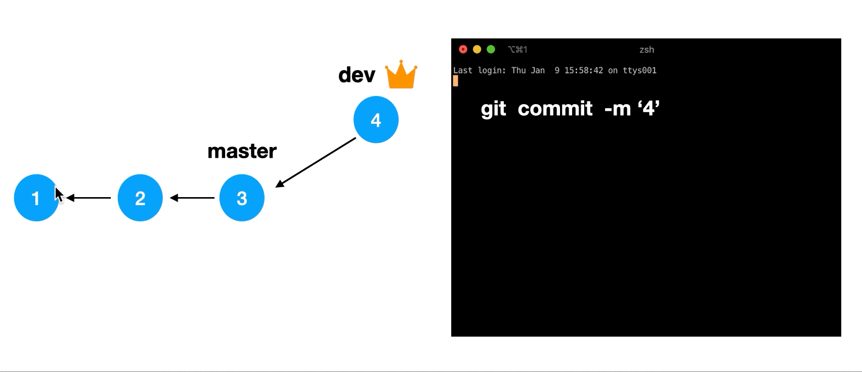 no-fast-forward 将对dev分支进行合并后产生一个新的merge commit,将其并入在master分支上,如下图: