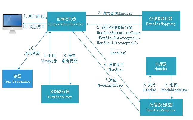 用户请求到达前端控制器,它就相当于mvc模式中的c,dispatcherServlet是整个流程控制的中心,