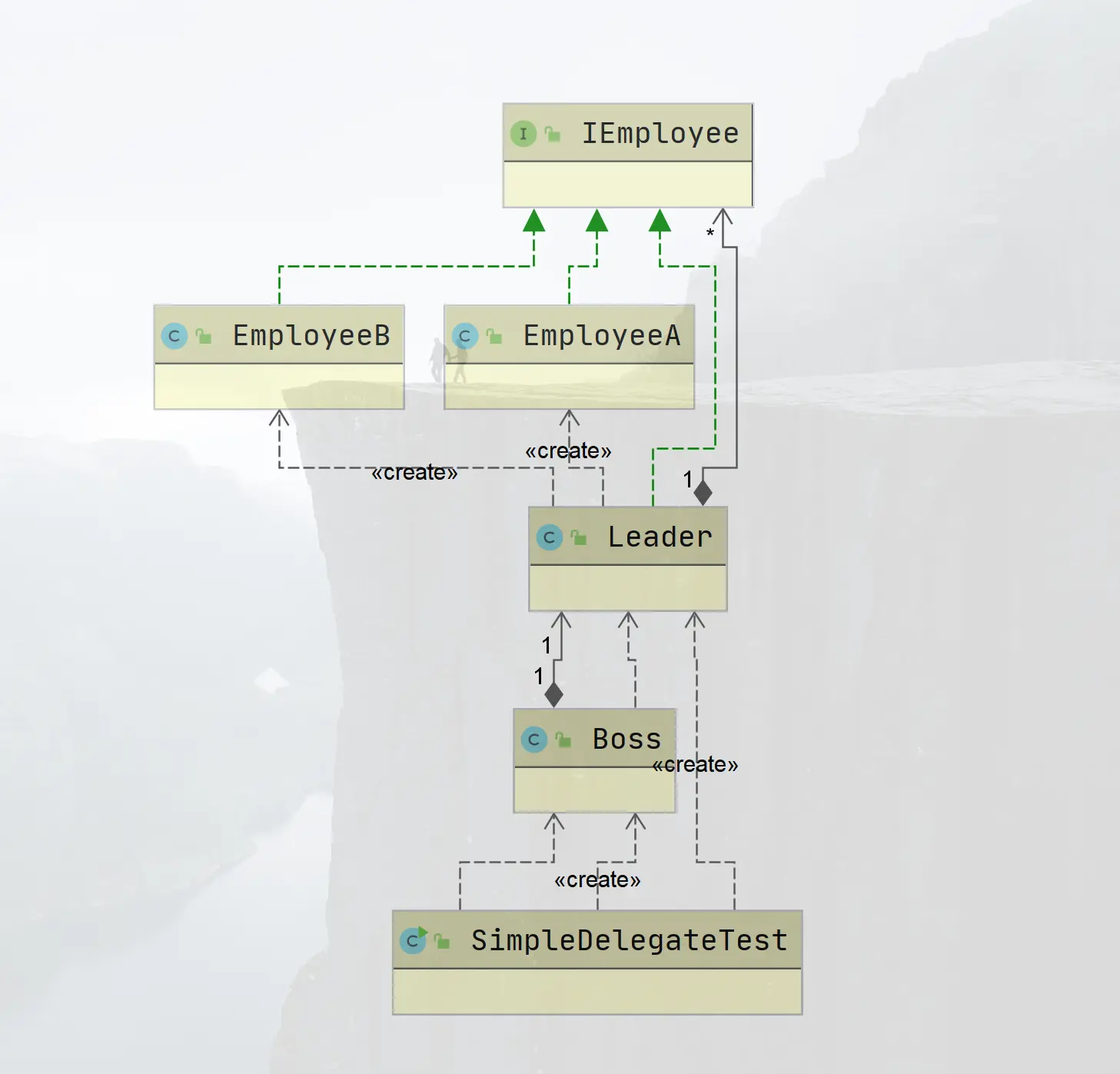 Boss给Leader下发任务后,Leader会根据实际情况来分配给响应的组员,我们将这一实际场景进行抽象化处理,用代码来进行实现首先我们要明确其中的关系,客户请求(Boss)、委派者(Leader)、被委派者(Target) 在这个构建中 委派者与被委派者都服务与客户请求,只是真实的操作时让被委派者执行的,有点像静态代理