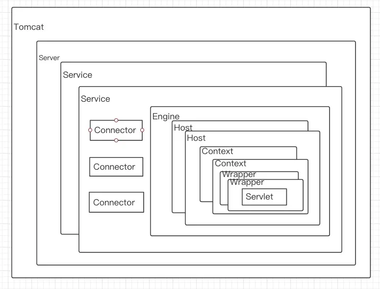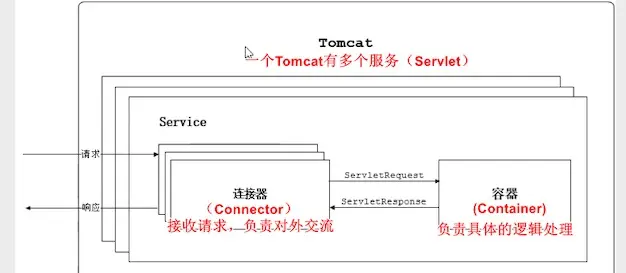 在tomcat中,最外层的就是tomcat,tomcat中有一个server。server中有多个service, 每个service可以单独对外服务。