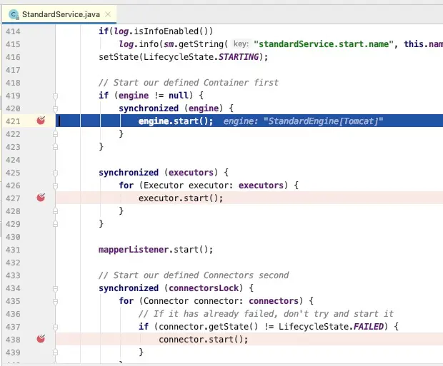 service标准实现StandardService 也是和init方法一样,对engine、exector、connector的start方法进行调用