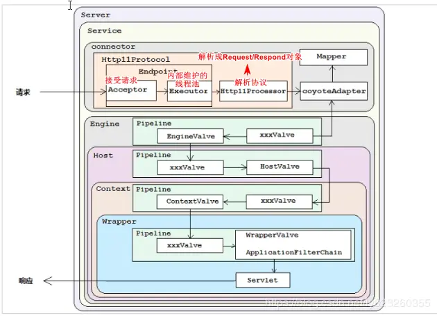 在管道中也运用了责任链模式,这和filter中是一样的,具体的大家可以单独研究这一块源码 每一个pipeline中都有一个大量的Valve,但是只有一个基础Valve 基础的Valve一般以容器+StandardValve命名,比如StandardengineValve 基础Valve调用下一层的容器阀。如上图所示