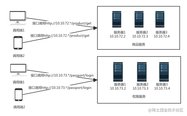 我们可以发现,当调用者需要调用两个模块的接口时需要单独调用各个模块并且在没有负载均衡功能的情况下需要指定各个服务器的ip。这种方式无疑会增加调用者的调用难度以及系统的复杂性。并且对于调用的流量把控也比较困难。