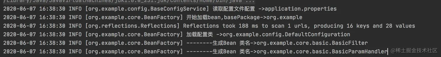 在BeanFactory中我们使用一个map来保存所有的bean对象,这个map也可以认为是我们前面提到过的IOC容器。在init方法中,我们扫描所有带有SimpleConfigure的类,并利用反射执行这些类中被@SimpleBean标记的方法。并把方法执行的返回值当做bean对象存入beanCacheMap中,并默认把方法的返回对象的权限定名当做beanName。