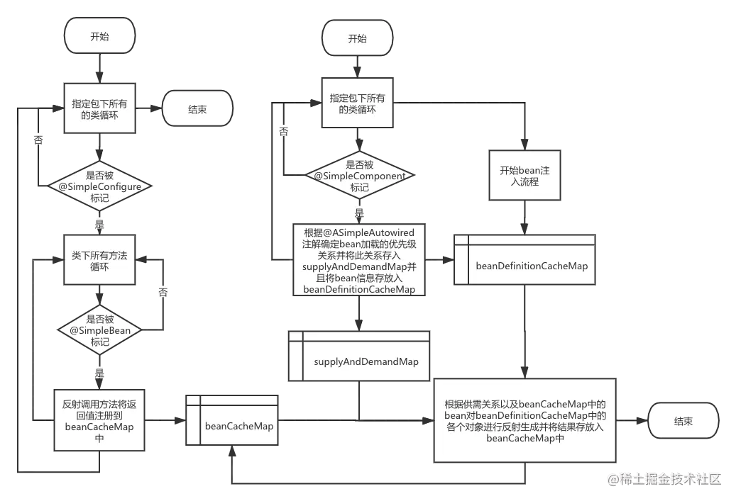 * 并利用反射调用其中被@SimpleBean注解标记的方法完成bean的生成。