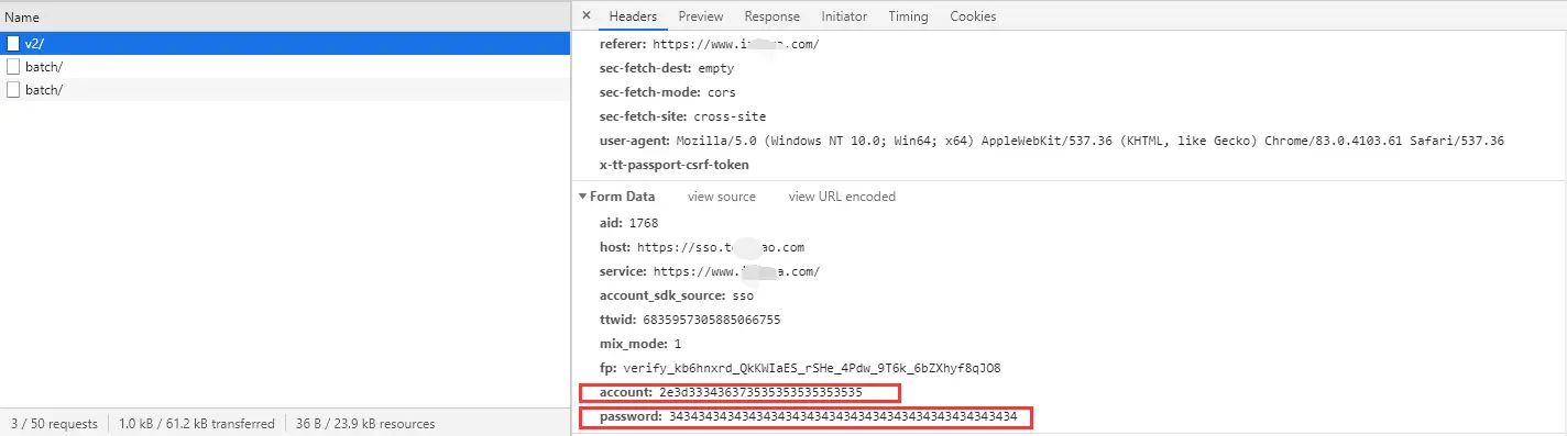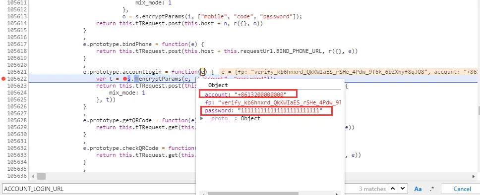 - 经过分析参数,只有account和password参数是通过加密生成的,其他几个参数都是写死或者从cookie获取即可;