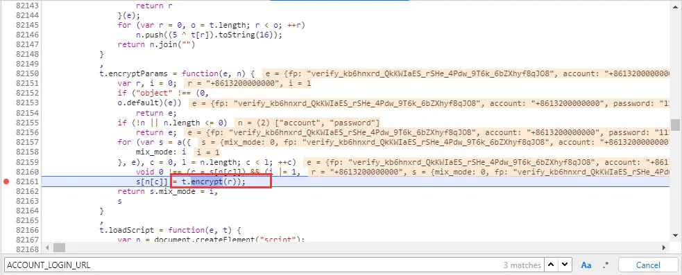 - 在该参数附近随便下两个断点调试看看结果,结果显示,在这之前已经完成了加密,所以我们得追踪